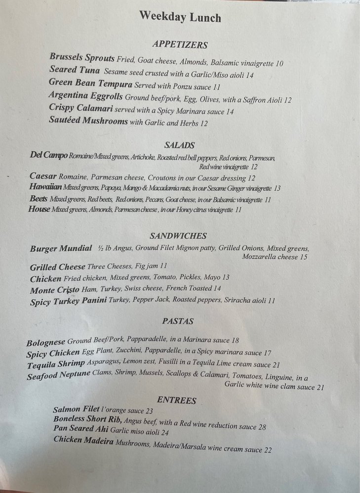 The menu features an array of enticing dishes, such as the Jack Daniel's Burger and the sumptuous Chesapeake Bay Scallops, each bursting with flavor. Salad lovers will appreciate the freshness of the Del Campo Salad and Hawaiian Salad, showcasing vibrant ingredients.